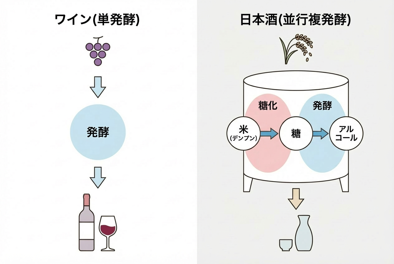ブドウには元々糖分が含まれているため、酵母がそれを直接アルコールに変えることができます。しかし、日本酒の原料である米の主成分はデンプンであり、酵母はデンプンを直接分解してアルコールを作ることができません。